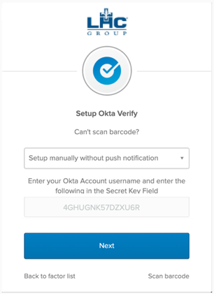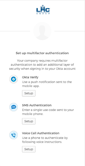 Alternatively, you can still use Okta MFA without the Okta Verify app. In this case, you will need to provide a phone number where you can be reached when you are attempting to access critical LHC Group applications. When activating your account, enroll in the Voice Call factor. That will enable Okta to call you with a code that you enter during the login process.