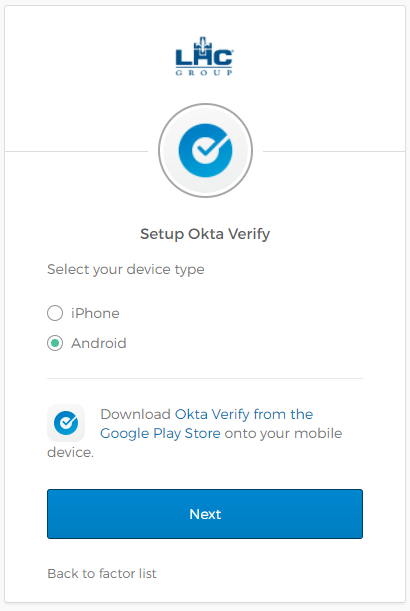 If you do not have an LHC Managed device, you must download Okta Verify to your personal device. Choose a link below (Apple or Android) to download and install the Okta Verify app to your device.