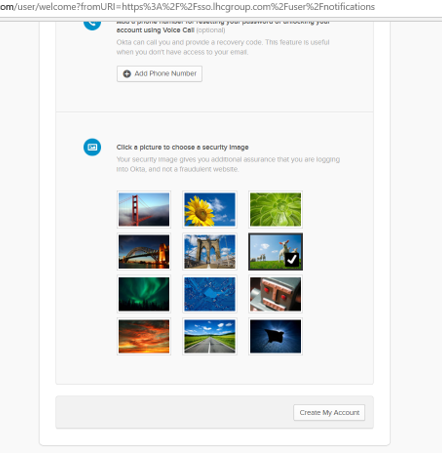 If Okta Verify is the first factor you setup, there is an additional screen once you login. Answer the remaining questions (includes choose a forgot password question, and selecting a picture/security image), then click on the “Create My Account” button.