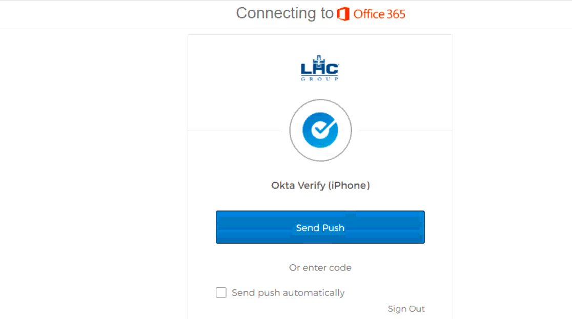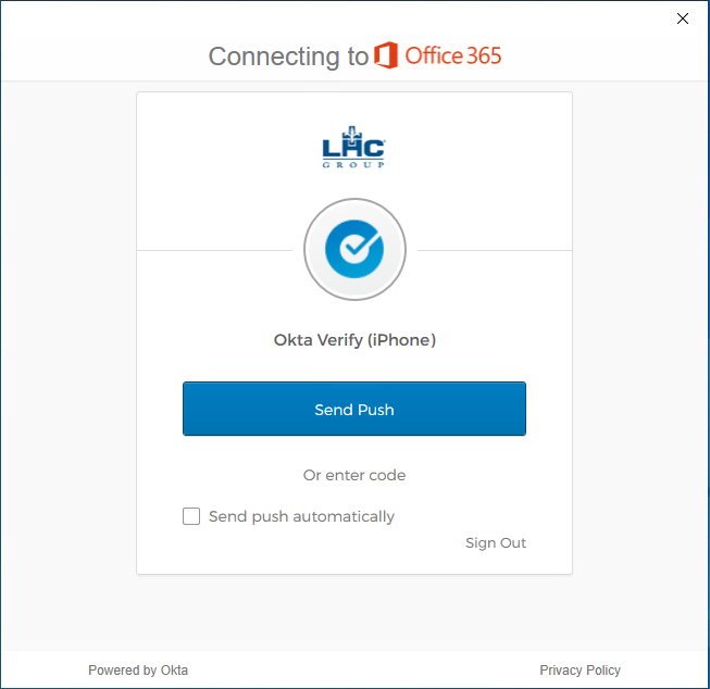 Important Note: If you are connected to the LHC Network, either in the office or through Cisco AnyConnect, you will be required to login to Okta to access each Office 365 application – Teams, Outlook, SharePoint…etc, every 12 hours. You will not be required to perform a multi-factor challenge.