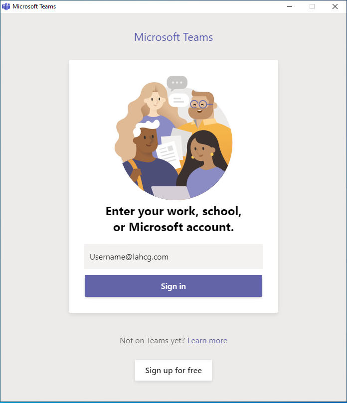 Open Teams App (if it does not open automatically) on your computer. Enter your userID with domain that was used to log in to your computer i.e. <userID>@lahcg.com