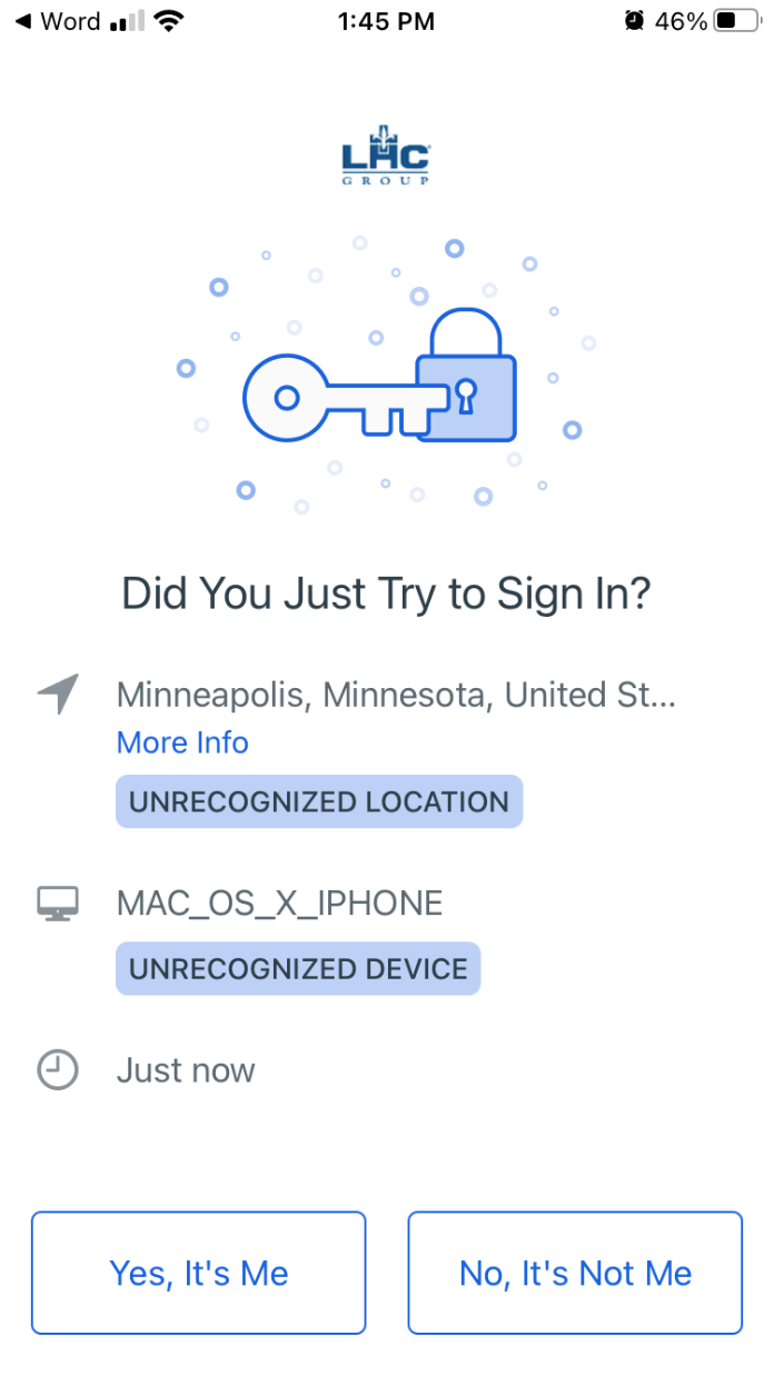 When you receive the Okta Verify push to your mobile device, click “Yes, it’s me” on your device.